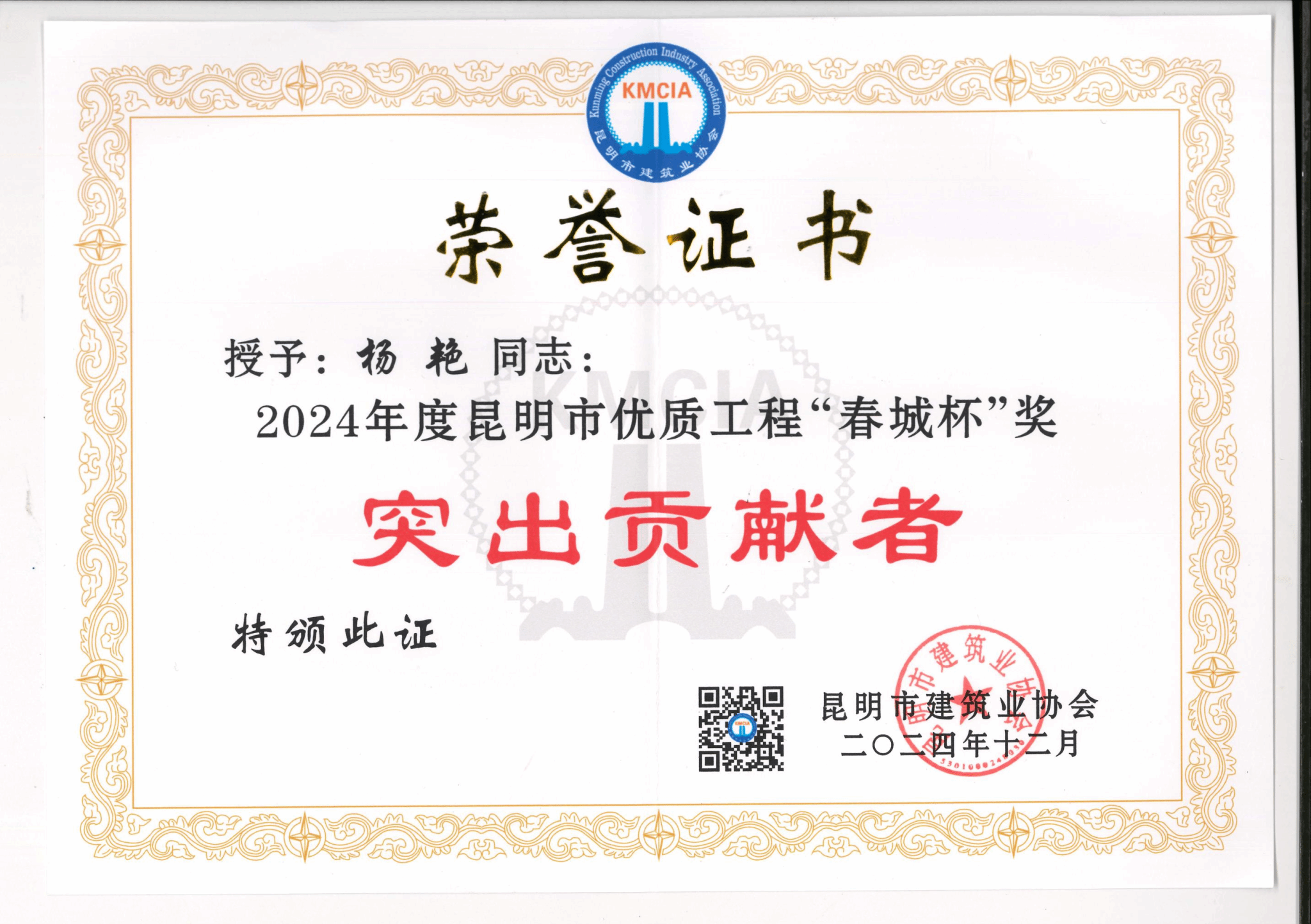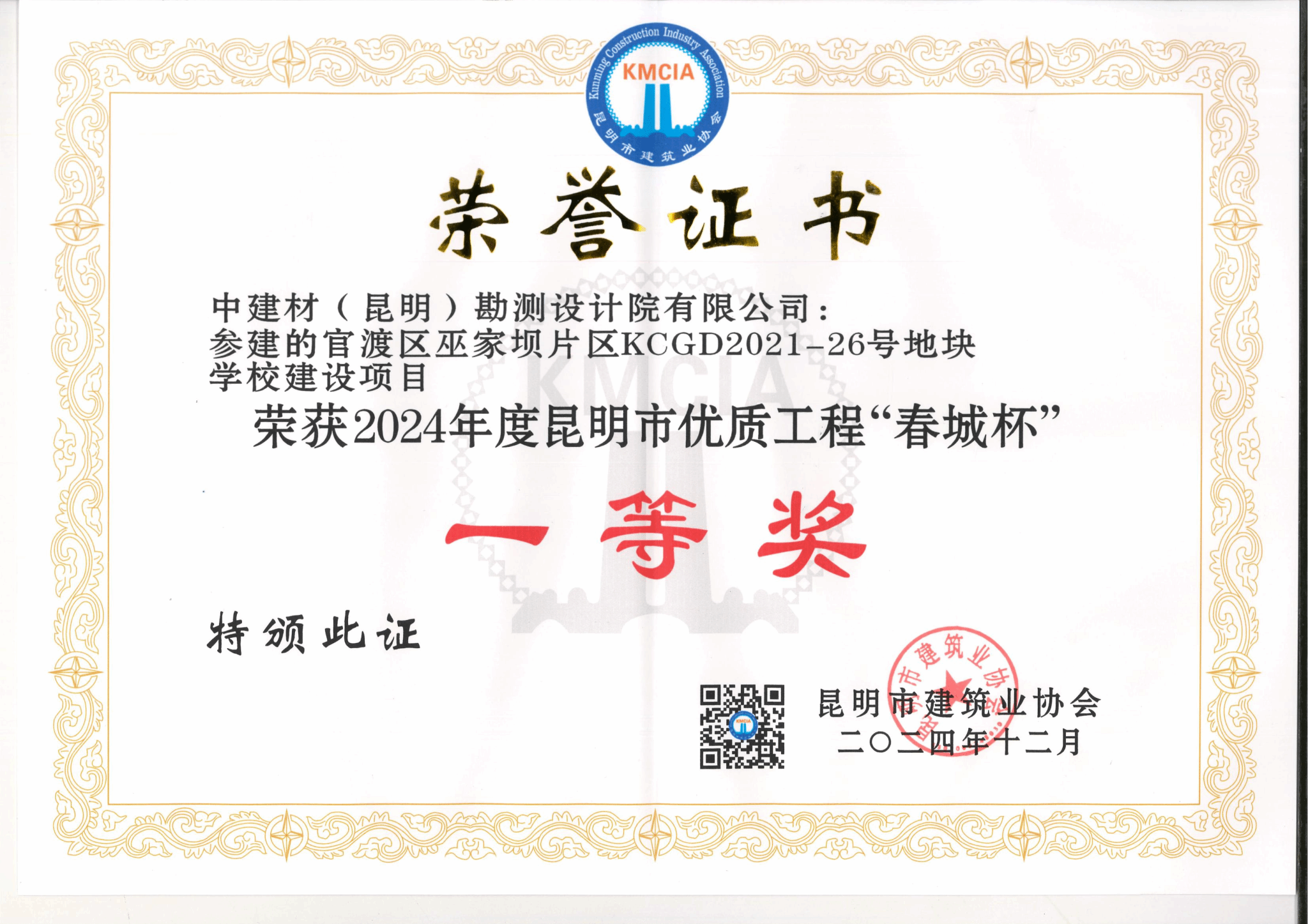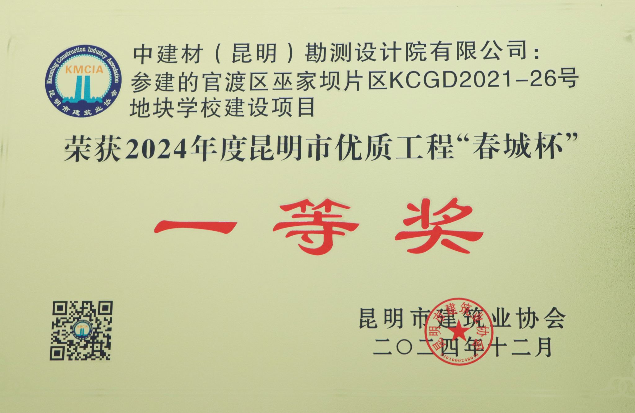 2024年12月,中建材(昆明)勘测设计院有限公司承担的官渡区巫家坝片区KCGD2021-26号地块学校建设项目荣获2024年度昆明市优质工程“春城杯”一等奖,杨艳荣获2024年度昆明市优质工程“春城杯”突出贡献者荣誉。