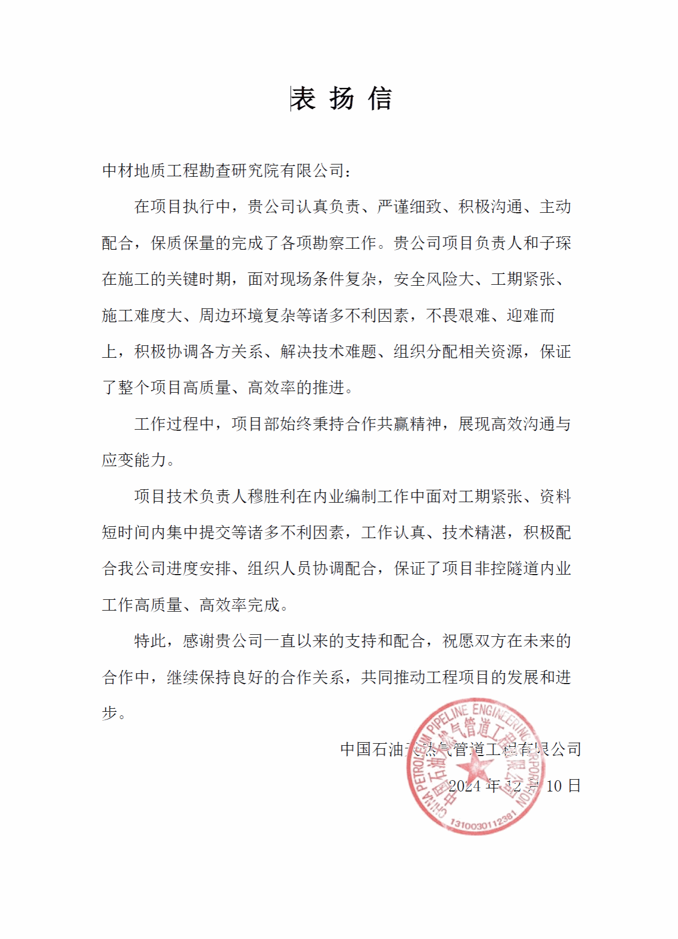 中国石油天然气管道工程有限公司对地勘院在项目中的支持和配合表示满意,致信表扬并期待在未来的合作中继续保持良好的合作关系,共同推动工程项目的发展和进步。此项目的成功彰显了地勘院的专业实力和技术水平,为双方未来的深入合作奠定了坚实基础。