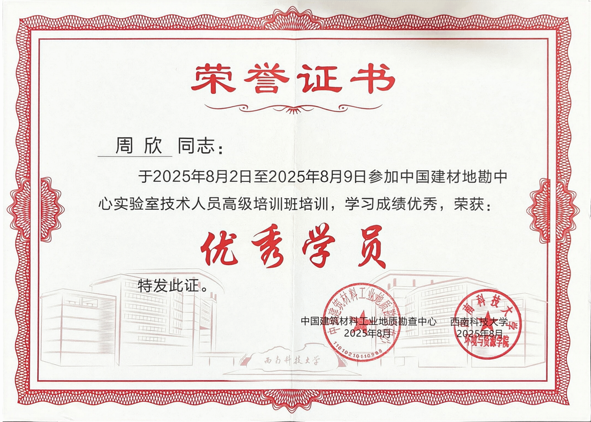 近日,中国建材地勘中心与西南科技大学联合举办首期实验室技术人员高级培训班圆满结束。本次培训山东总队(有限公司)共有2名青年骨干参加,安全技术研究院主任工程师韩京增,凭借出色表现脱颖而出,并作为学员代表交流发言;安全技术研究院周欣,表现突出,荣获“优秀学员”称号。