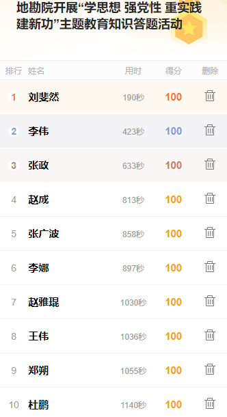 为深入学习贯彻习近平新时代中国特色社会主义思想和党的二十大精神,推动地勘院主题教育走深走实,坚决拥护“两个确立”、增强“四个意识”、坚定“四个自信”做到“两个维护”,切实引领地勘院全体党员把主题教育转化为推动企业高质量发展的强大动力,地勘院于近日举办线上“学思想、强党性、重实践、建新功”主题教育知识答题活动。各支部党员、积极分子积极参与答题。