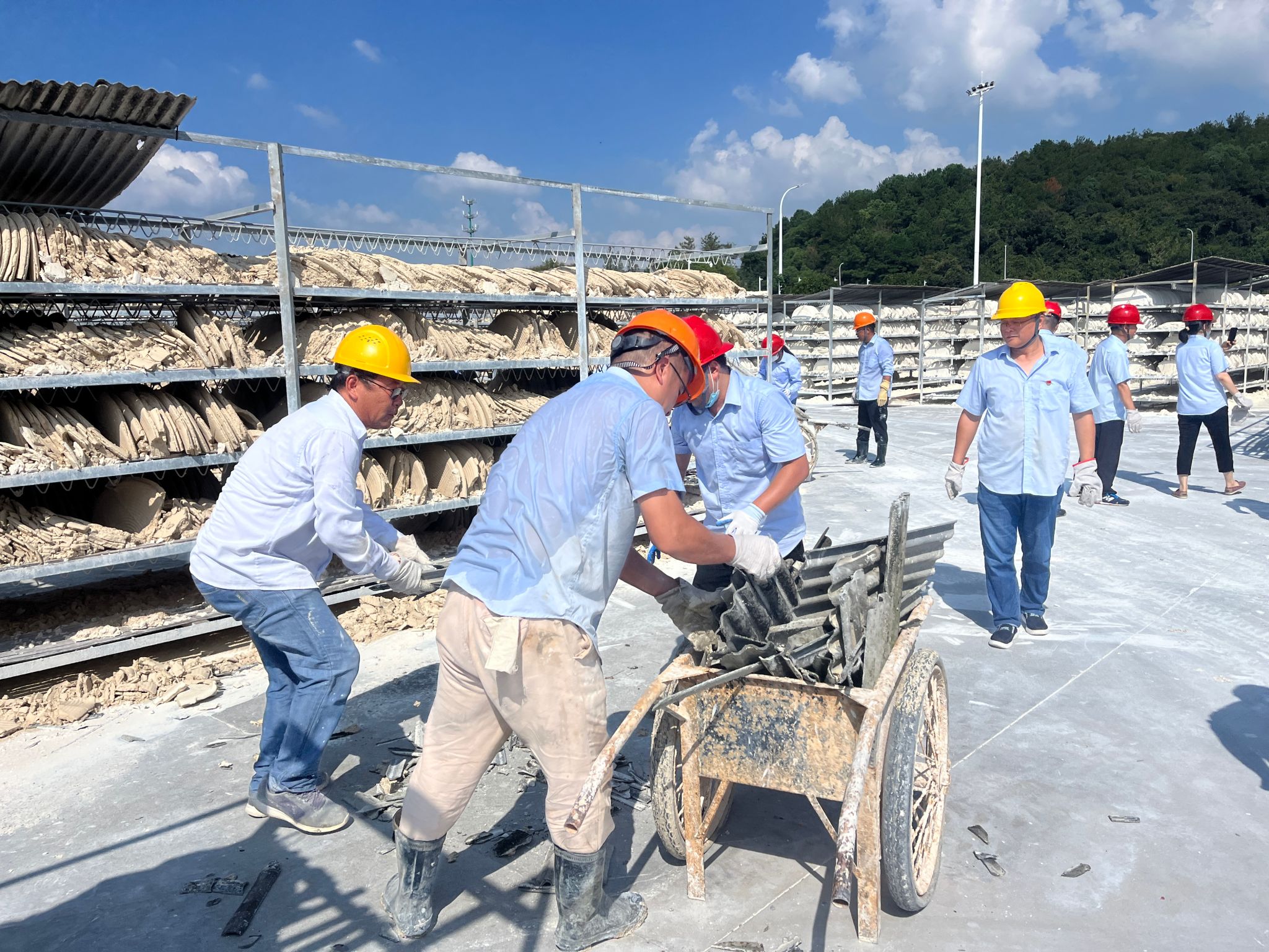 在厂部领导的指挥下,大家穿戴整齐,迅速拿起劳动工具,分组开展劳动,公司领导带头全幅武装投入到晒场的清理中,强壮有力的男同胞们当仁不让将推小推车的任务扛起来,其余的同志有的攀上晒泥架清理掉落在产品中的碎瓦片,有的用铁锹将细碎的竹片杂物等收集归堆,有的拣选破损的瓦片搬运到小推车上。女同胞们巾帼不让须眉,干的热火朝天。台风过后正是高温不退的时候,火辣辣的阳光下,同志们的衣服很快都湿透了,但无人叫苦叫累,连续奋战仍然干劲十足。团结力量大,高温酷暑下,在大家的共同努力下,经过2个小时的埋头苦干,晒场上的杂物被基本清理干净。